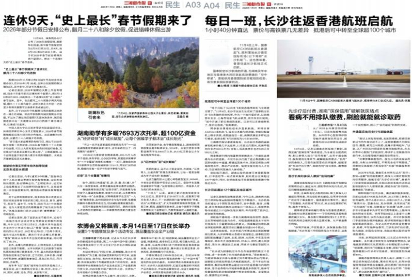 《三湘都市报》在指导性方面,报纸始终关注社会热点和民生问题,通过深入的调查和专业的分析,为读者提供权威的解读和建议。无论是经济形势的分析、政策法规的解读,还是生活消费的指南,报纸都以客观、公正的态度,为读者指明方向。例如,在房地产市场波动时,报纸会邀请专家进行分析,为购房者提供参考;在就业形势紧张时,会发布相关的招聘信息和就业指导,帮助求职者找到合适的工作岗位。这种指导性不仅体现在宏观层面,更深入到读者的日常生活,让读者在阅读中感受到实实在在的帮助。 服务性是报纸的又一重要特色。报纸始终以读者为中心,致力于为读者提供全方位的服务。从生活服务到信息服务,从文化娱乐到健康养生,报纸涵盖了生活的方方面面。在生活服务方面,报纸会发布各种便民信息,如天气预报、交通路况、水电维修等,方便读者的日常生活。在信息服务方面,报纸通过及时、准确的新闻报道,为读者提供最新的资讯。同时,报纸还开设了各种服务热线和互动平台,让读者能够直接与报纸互动,反馈意见和建议,真正实现了为读者服务的宗旨。