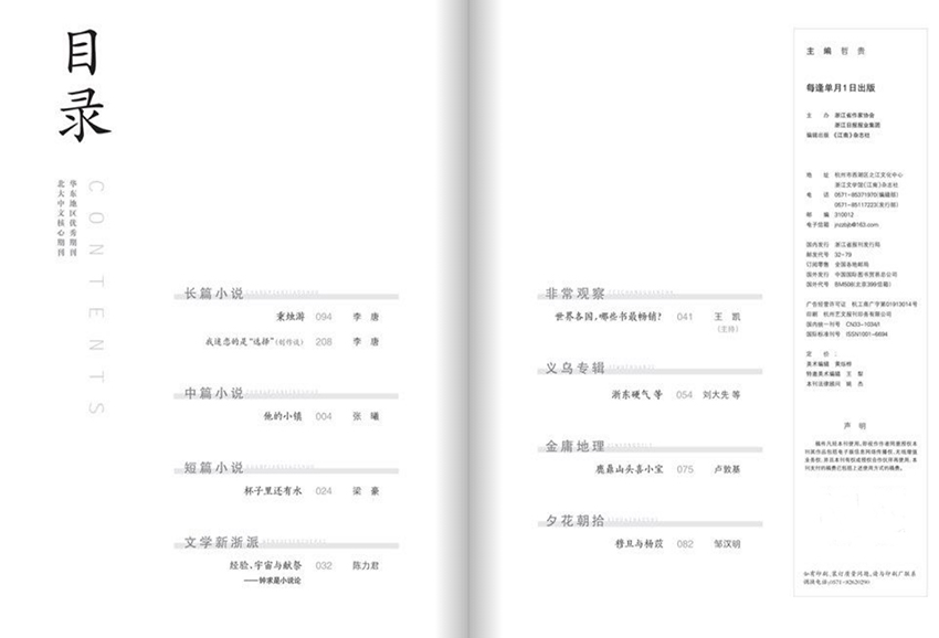 全年一共6期,双月刊,单期214页,彩色铜版纸。出版单位:浙江省作家协会