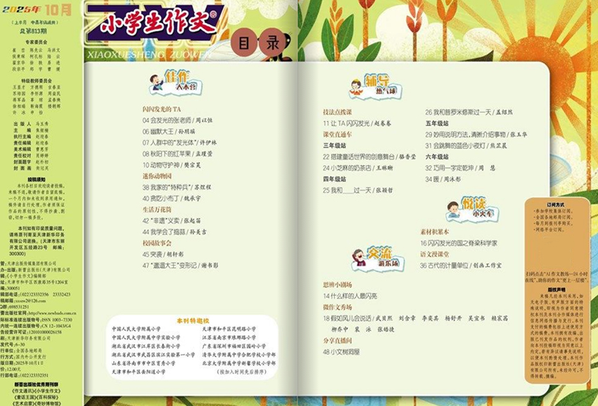《小学生作文》杂志内容体系科学、层次分明,栏目设置丰富多样,极具针对性与实用性。设有“佳作展台”“名师点评”“写作小锦囊”“同题竞写”“好词好句积累”“病文升格”“趣味练笔”等经典栏目。“佳作展台”精选全国各地小学生的优秀习作,题材广泛、语言生动、情感真挚,为同龄人提供可学可仿的写作范本;“名师点评”邀请一线特级教师、教研员对作文进行逐段分析,点明亮点、指出改进方向,帮助学生理解“好作文”的标准;“写作小锦囊”则以通俗易懂的语言,讲解审题技巧、结构安排、细节描写、开头结尾等实用技法,让孩子“一学就会,一用就灵”。