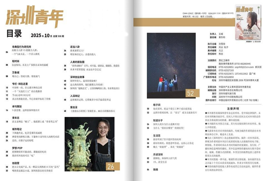 《深圳青年》杂志以“新潮、前卫、时尚、灵动”为鲜明特色,以“励志、进取、奋斗、成功”为核心宗旨,持续为读者开拓视野,传递富有生活温度与时代气息的内容,在广大青年群体中拥有极高的流行度与大众辨识度。 杂志的成长轨迹,与深圳这座城市的崛起同频共振。它诞生于思想解放、万象更新的年代,自诞生之日起便承载着弘扬特区精神、展现青年风貌的使命。它关注青年所思所想,回应青年所忧所盼,成为一代又一代深圳青年乃至全国青年的精神伙伴。无论是初入职场的迷茫,还是创业路上的拼搏;无论是对美好生活的向往,还是对社会现实的思考,杂志始终以温暖而坚定的笔触,为青年照亮前行的道路。