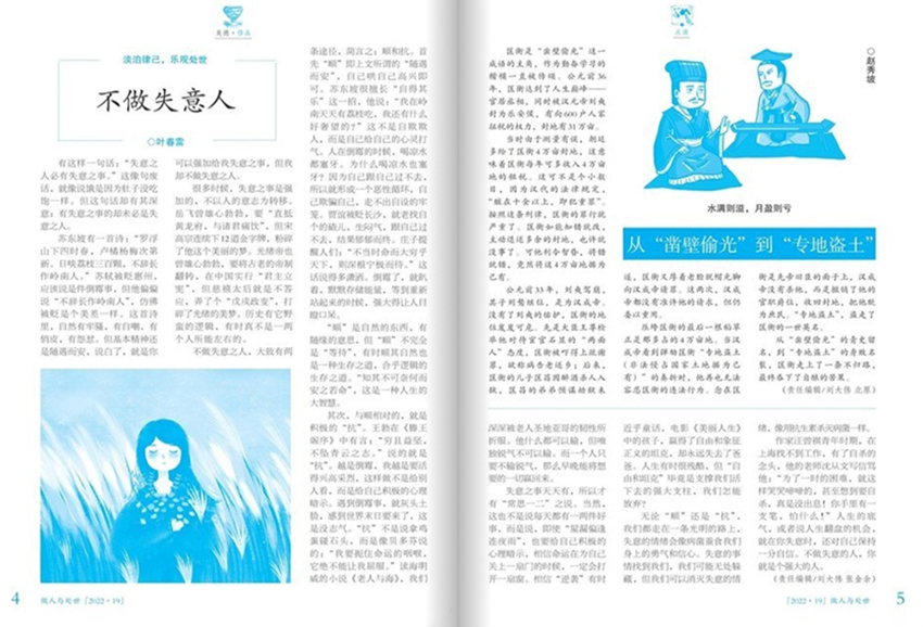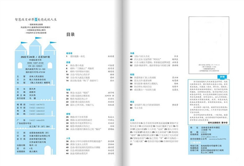《做人与处世》杂志始终坚持以“做人”为根本,以“处世”为实践,旨在突出其独特的文化特色。它不空谈大道理,而是通过真实感人的故事、古今中外的哲理名言、贴近现实的生活案例,将深刻的道理融入轻松的阅读之中。无论是职场中的沟通技巧,还是家庭中的情感维系;无论是面对挫折时的心态调整,还是取得成就后的自我沉淀,杂志都能提供切实可行的建议和启发。它让我们明白:做人,贵在真诚、谦逊、有底线;处世,重在智慧、包容、懂进退。 为了倡导快乐阅读,杂志在内容编排和形式设计上下足了功夫。内容丰富多彩,既有感人至深的亲情故事,也有发人深省的哲理短文;既有历史人物的处世智慧,也有当代青年的成长感悟。形式新颖多样,图文并茂,全彩印刷,一翻开便能吸引读者的眼球。精美的插图、清新的版式、富有节奏感的排版,让阅读变成一种享受。无论是课间小憩,还是睡前翻阅,都能在轻松的氛围中汲取智慧的养分。
