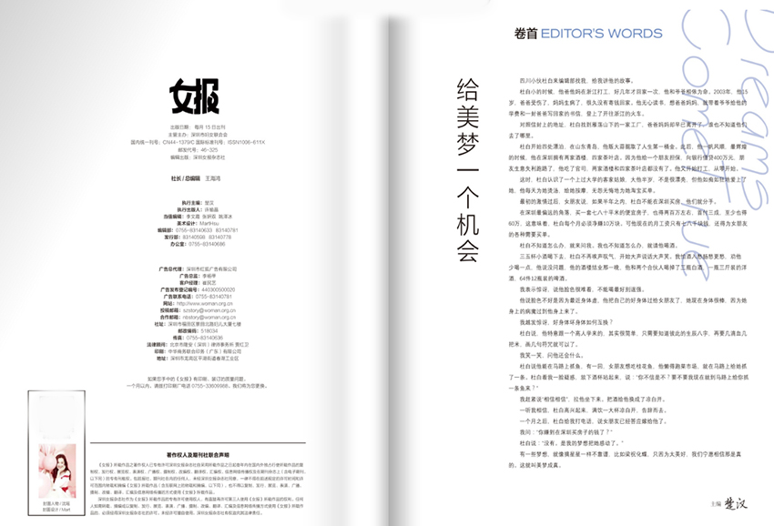 《女报》杂志的关怀,始于“人”的本身。它关注女性的情感世界,用细腻的笔触记录那些关于爱与成长、遗憾与重逢的青春故事。这些故事或许平凡,却因真实而动人;或许曲折,却因坚韧而闪光。在“记录青春纯美情感故事”的使命下,杂志不刻意渲染狗血剧情,也不贩卖焦虑,而是以共情的视角,展现女性在感情中的独立思考与自我成长。它告诉读者:爱,是美好的,但自我,更值得守护。 而在身体与心理的层面,杂志展现出深切的人文关怀。它关注女性的身体健康、心理状态与自我认同,尤其难能可贵的是,它将目光投向那些“身残志不残”的女性群体。她们或许行动不便,或许经历病痛,但内心依然炽热,意志依旧坚定。杂志为她们发声,讲述她们如何在逆境中绽放光芒,如何用坚韧改写命运。这些故事不是悲情的诉说,而是力量的传递——它让每一位读者明白:真正的美,不在于外表的完美,而在于灵魂的挺拔。