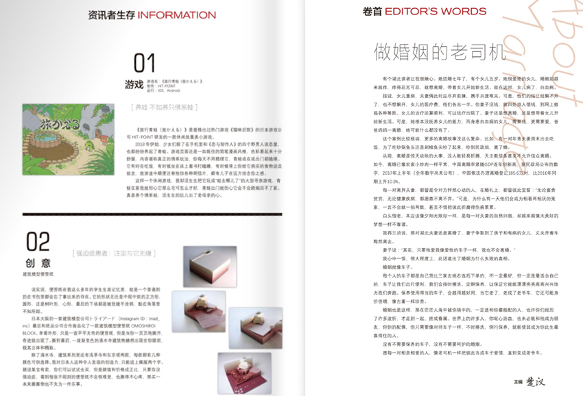 杂志的体裁丰富多样,融合了人物专访、情感故事、生活方式记录、实用指南与社会观察,既有深度,也不失温度。它用平实而有力的语言,讲述普通女性的不凡经历,让每一位读者都能在其中看到自己的影子,也看到前行的方向。