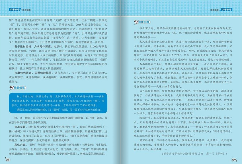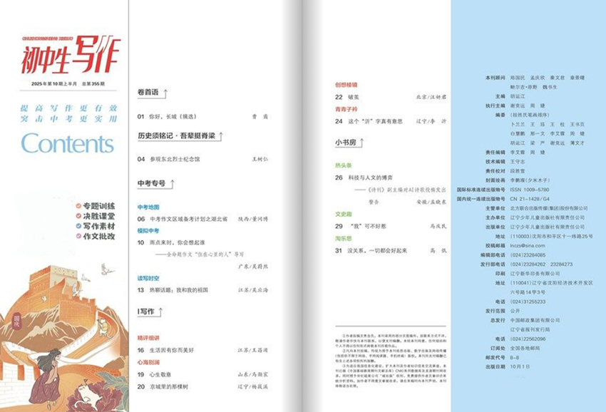 在内容广度上,杂志不仅关注应试能力的提升,更注重学生综合语文素养的培养。杂志设有“阅读思辨”“素材金库”“写作工坊”“中考直通车”等多个板块,既紧密配合现代文阅读、文言文理解与综合性学习要求,又注重拓展学生的知识视野与思维深度。通过品读经典、分析时事、积累金句、训练逻辑,帮助学生构建完整的写作知识体系,实现从“会写”到“写好”的跨越。