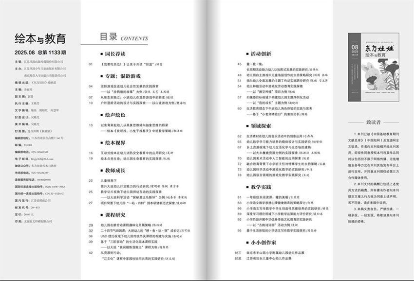 作为连接绘本艺术与学前教育的桥梁,《东方娃娃绘本与教育杂志》始终以“儿童为本”的教育理念为引领,通过图文并茂的呈现形式、权威实用的专业内容、中西融合的文化视野,不仅为幼儿教育工作者提供了专业交流的平台,也为家庭亲子阅读注入了科学指导,持续助力幼儿综合素质的全面发展,成为学前教育领域兼具影响力与美誉度的标杆期刊。