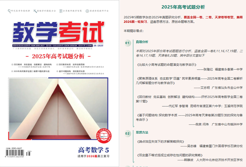 杂志内容涵盖教育理论前沿、教学方法创新、考试命题研究及备考复习策略等多个核心领域。它致力于打通教学与考试之间的关键环节,既注重对课堂教学实践的深入指导,也强调对各类考试规律的精准剖析。刊物旨在帮助教师提升专业素养与教学效能,同时为学生提供科学有效的学习与备考支持,是连接“教”、“学”、“考”三者的桥梁与纽带。