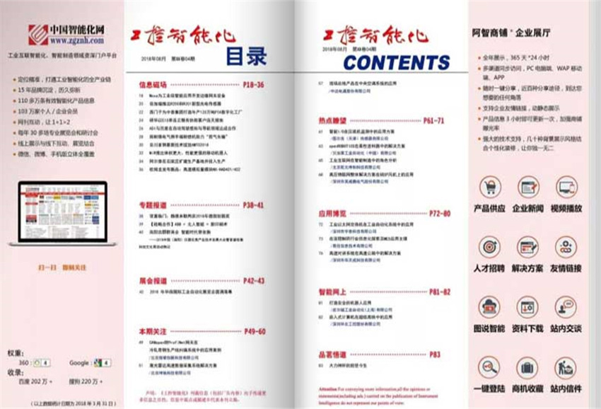 杂志以“技术引领、应用驱动”为宗旨,设置十大核心栏目:信息磁场聚焦行业动态与市场趋势;高管访谈深度对话企业领袖;专题报道解析技术热点与政策导向;应用博览展示跨行业解决方案;热点瞭望探讨前沿技术如AI、机器学习在工控中的应用;智能化刊中刊整合技术专题;本期关注聚焦行业焦点问题;智能网上链接数字化资源;智能化您上提供用户互动平台;品名悟道分享技术哲学与行业洞察。内容涵盖工控机、PLC、工业以太网、机器视觉、嵌入式系统等全产业链技术,兼顾理论深度与实践价值。 杂志依托庞大的行业数据库与专家网络,构建“产学研用”一体化生态。一方面,联合西门子、ABB、施耐德等国际企业及华为、中控技术等国内龙头,发布技术白皮书与产品评测;另一方面,通过案例库收录超500个行业应用实例,如某汽车工厂的智能产线改造、某化工园区的安全监控系统等,为中小企业提供可复制的转型路径。此外,杂志定期举办“工控智能化峰会”,促成技术合作与项目对接,推动行业标准化进程。
