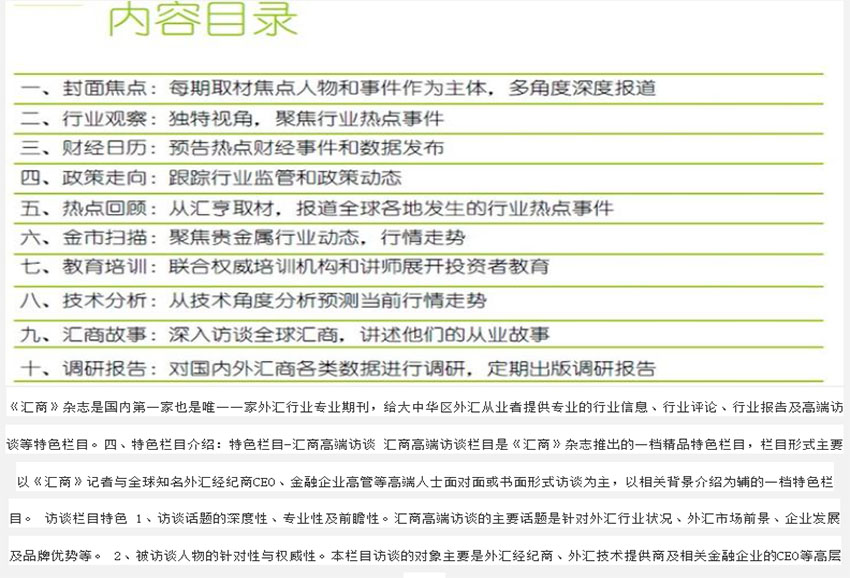 杂志内容兼具新闻性与深度性,开设卷首语、封面焦点、行业观察、政策走向、热点回顾、金市扫描等核心栏目,多角度解读业内热点事件。其“汇商高端访谈”特色栏目,聚焦全球知名外汇经纪商CEO、金融企业高管等行业领军者,围绕市场前景、企业战略等议题展开深度对话,兼具前瞻性与实操价值;政策解读板块联合权威专家机构,及时分析监管动态对行业的影响,为从业者提供合规指引。