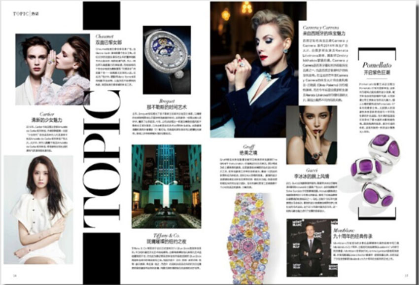 杂志设置了“热话”“臻品”“格调”“传奇”“定制”“创想”等核心栏目,构建起立体的内容矩阵。“热话”栏目聚焦珠宝及腕表行业的最新动态与设计圈热点事件;“臻品”板块精选全球顶级珠宝新品,成为品位人士的选购指南;“格调”栏目则探索珠宝与服饰的搭配艺术,引领当季时尚风潮;“传奇”栏目通过讲述品牌背后的人物故事与历史渊源,挖掘珠宝承载的文化记忆;“定制”板块则聚焦匠心工艺,展现非量产高级珠宝的独特价值,全方位满足不同读者的阅读需求。