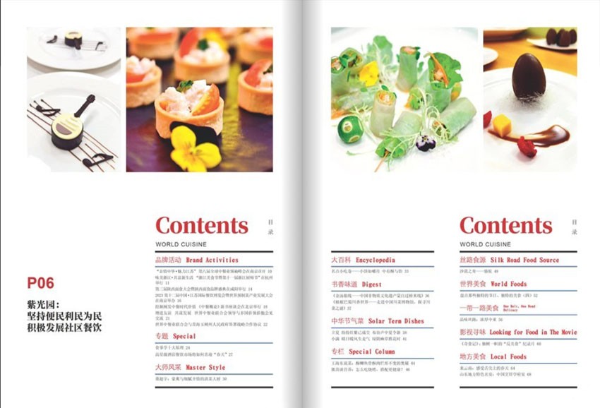 《餐饮世界》主要栏目:焦点、餐馆精英、饮食文化、技艺经典、饮食养生、五洲传真、名题名店、经营真言。