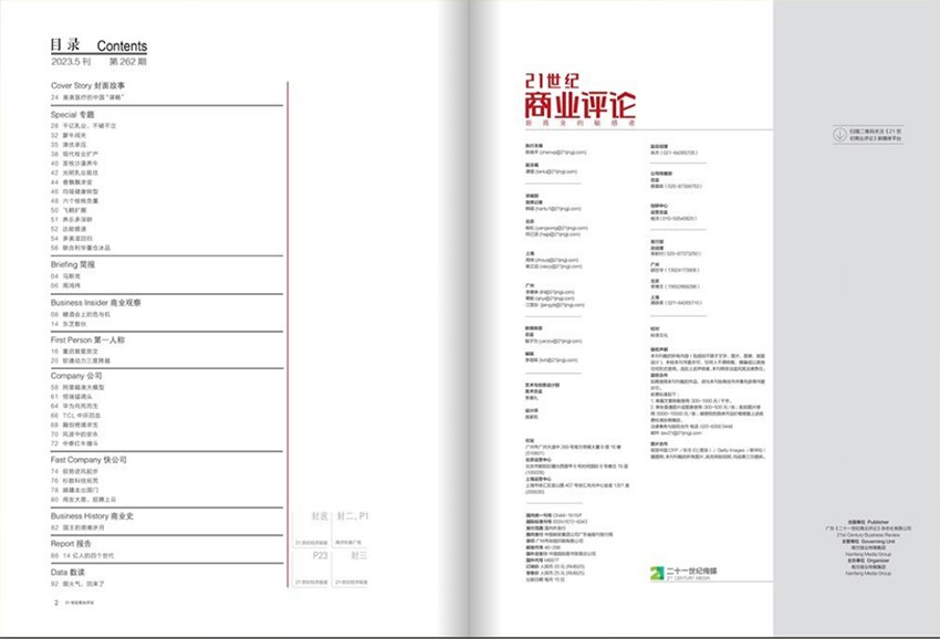 《21世纪商业评论》主要栏目:特别报道、议程、封面故事、现场、价值、远见、态度。