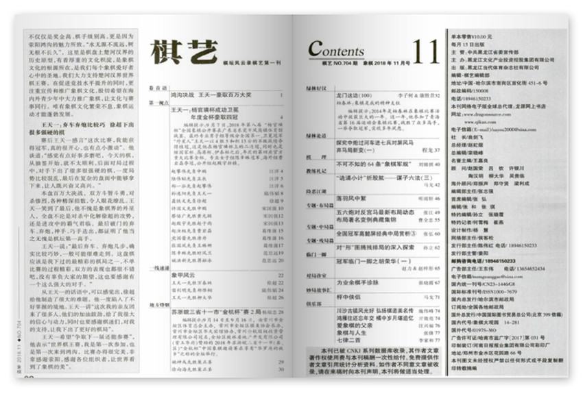 该杂志内容涵盖了棋艺活动报道、比赛解说和棋手特许专栏。其中,棋艺活动报道着重介绍全球棋艺项目举办情况及赛事相关活动。比赛解说则为广大棋迷们提供了权威、深入、独立的态度,深入剖析赛事背后的突出战术和精彩争斗过程,丰富读者棋艺认知和对棋类运动的了解。棋手特许专栏则致力于推荐国内优秀的棋手,分享他们的棋艺经验和思路,为读者提供针对性的学习指导。