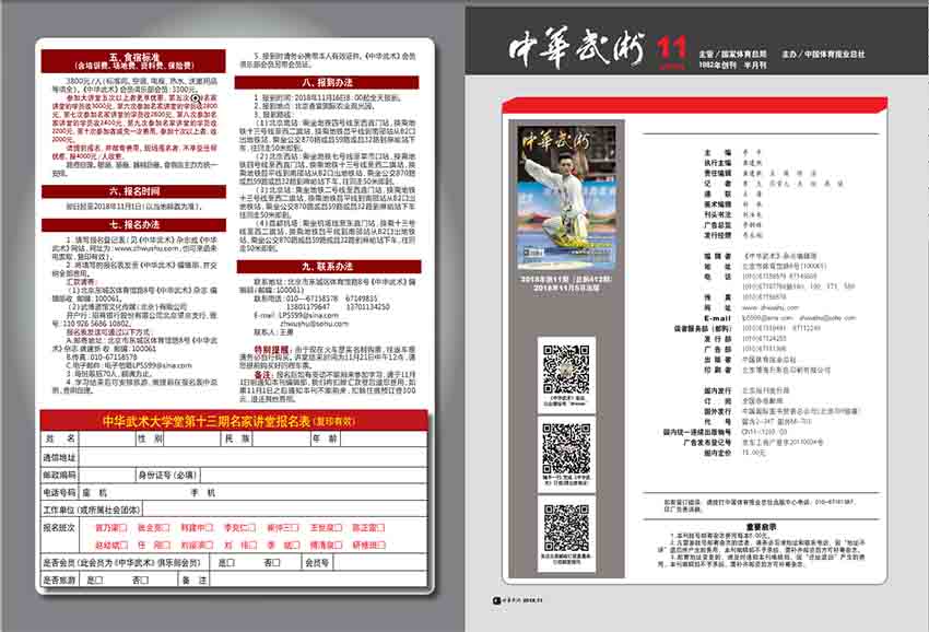 《中华武术》杂志秉承“专业、严谨、权威、活力”的理念,不仅记录了中华武术传承和历史文化,也及时互动反映武术最新的进展,为中国武术爱好者提供专业、全面、深入的中华武术知识和文化信息。同时,该杂志也为中华武术文化的传播、交流和发扬做出了积极努力。《中华武术》杂志定期报道全国和国际各类武术比赛,包括国际太极拳友谊锦标赛等盛会,为武术爱好者们呈现精彩的武林盛事,帮助读者更好地了解和升华中华武术文化。