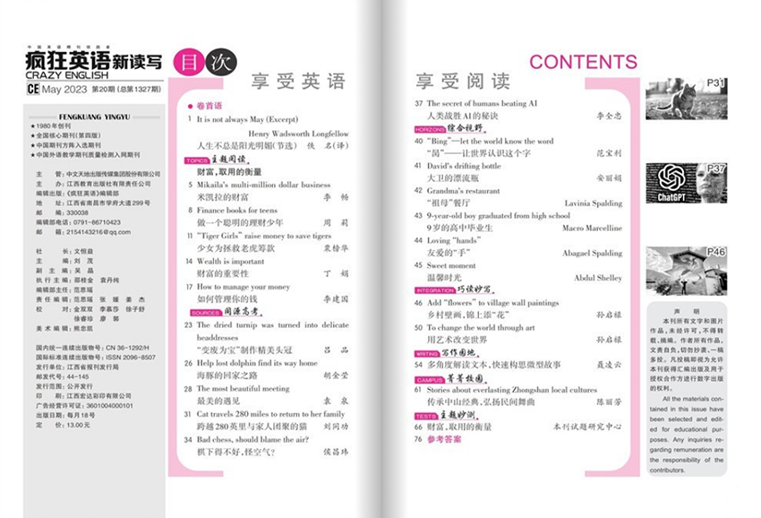 该杂志内容丰富,既包括英语学习中的基础知识和技巧,也将提高学习者的实际应用能力和文化素养。例如,该杂志会结合英语课堂的教学情况,在语法和词汇方面提供实用的学习技巧,同时也会提供口语训练、阅读和写作举例,以帮助读者掌握实际应用技能。