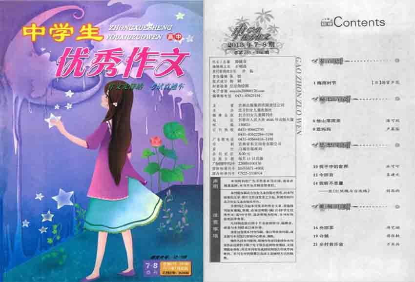 《中学生优秀作文》的主要栏目:金素材、时文素材、名校作文、作文讲堂、在路上、作文素材实战点击、满分作文读解、新格言等。