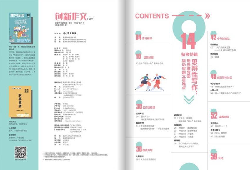 《课堂内外·创新作文》(月刊)经过多年的不懈努力,流行度高,大众辨识度广,创刊于2001年,开拓了视野,带给读者富有生活特色的内容。《课堂内外·创新作文》是一本紧扣新课标教学,解决初中学生所面临的各种作文问题,帮助他们提高写作能力,开发创新思维,在中考中取得作文高分,同时对热爱写作的学生进行创新性写作辅导的优秀作文刊。