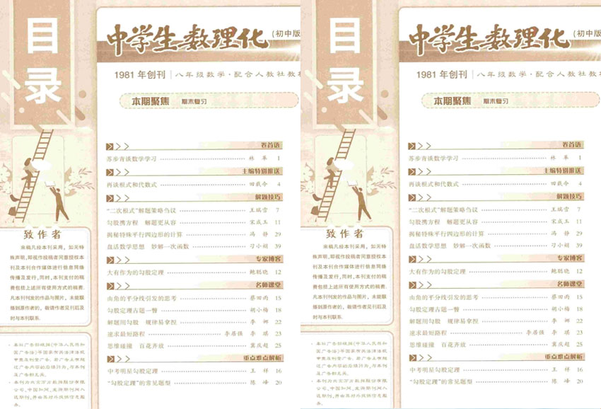 《中学生数理化》(月刊)经过多年的不懈努力,流行度高,大众辨识度广,创刊于1981年,开拓了视野,带给读者富有生活特色的内容。《中学生数理化》一贯坚持以为素质教育服务、帮助中学生打好数理化基础为宗旨,以打造权威、经典、实用的精品报刊为原则,努力体现“贴近课堂教学实际,贴近学生学习和生活实际”的特点,精心创造“让老师省心、家长放心、学生开心”的精神食粮,融知识性、科学性、趣味性、新颖性、实用性于一体,深受老师和学生喜爱。《中学生数理化高考理化版》更名为《中学生数理化自主招生》,《中学生数理化高考数学版》更名为《中学生数理化高考使用》。