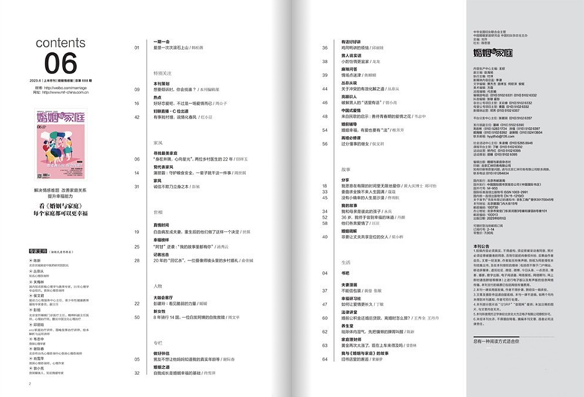 该杂志内容涵盖婚姻、恋爱、家庭、亲子、性与健康等方面,对于家庭成员的发展、子女成长、婚姻生活等方面进行了深入探讨。杂志强调,婚姻、爱情、家庭与亲子关系贵在细节,涉及方方面面的内容,如沟通、包容、互动、培养等,正因为这些方面的因素,导致了一个完整健康的家庭。