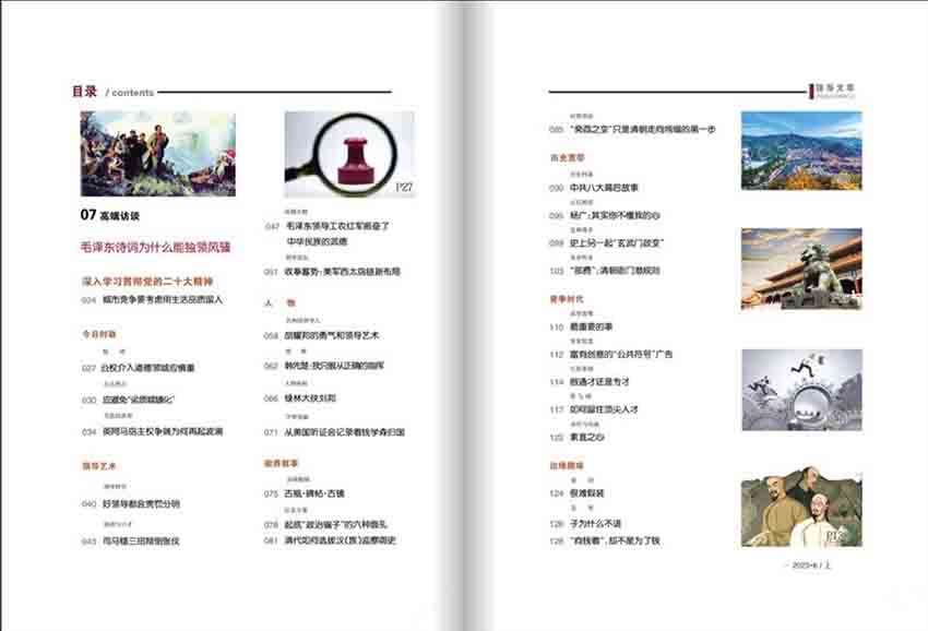 《领导文萃》主要栏目:统御与谋略、主题阅读、今日政经、官场纵横谈、看台湾、历史借镜、办公圆桌等。